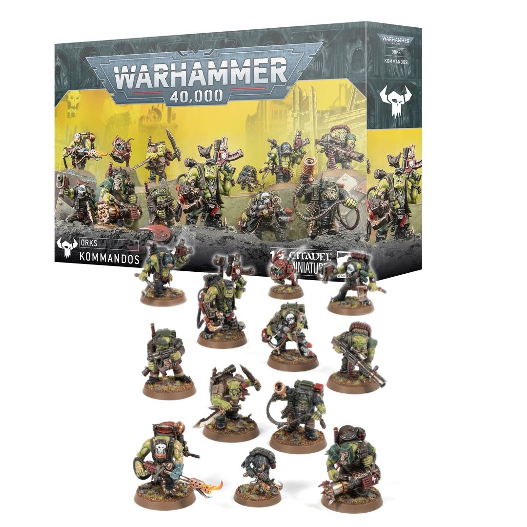 WARHAMMER 40K, ORKS: KOMMANDOS – Kommandos aren’t trusted by any right-thinking Orks – they sneak up on the enemy rather than charging in headlong and have an unhealthy fascination with very big knives and their application to people’s backs, throats, and guts. This multipart plastic kit builds 12 Kommandos.