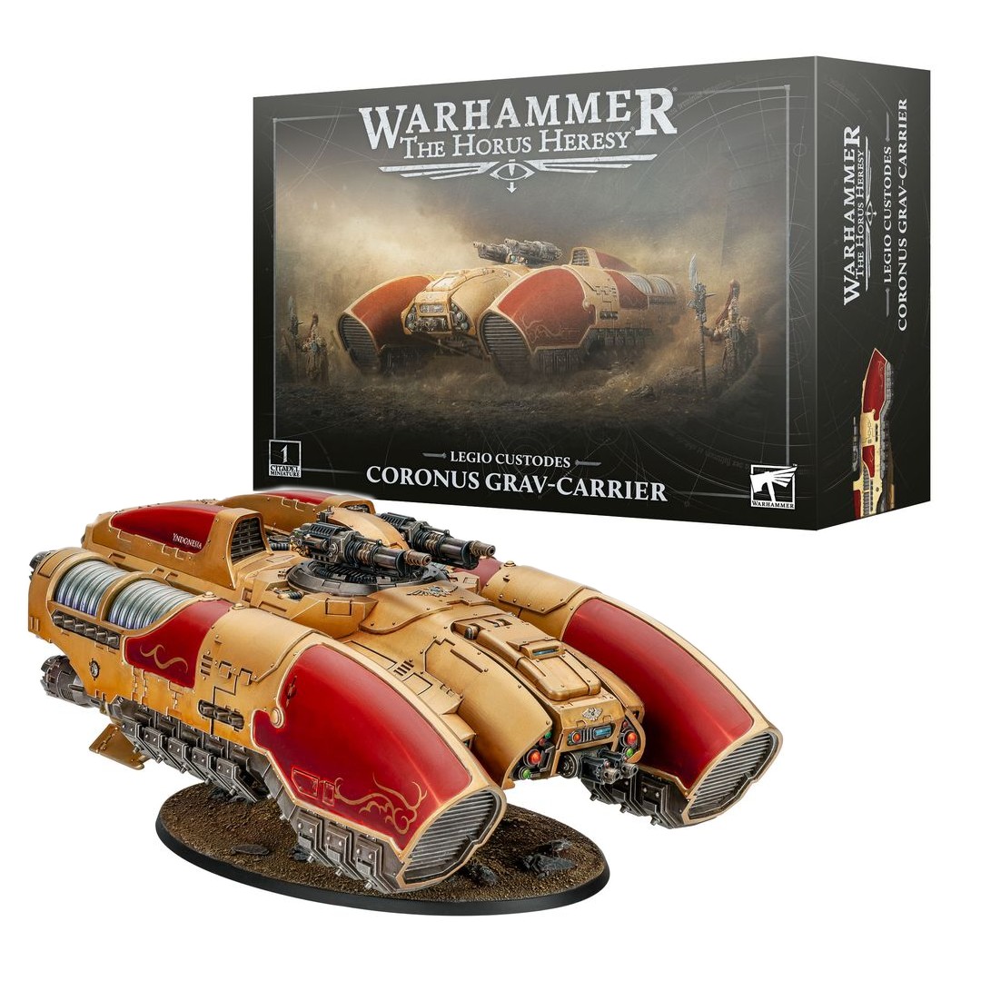 CALADIUS GRAV-CARRIER – The Coronus Grav-carrier grants the Legio Custodes a degree of speed and agility unmatched by the grinding armor of the Imperium’s other hosts, allowing them to deploy, redeploy, and evade.