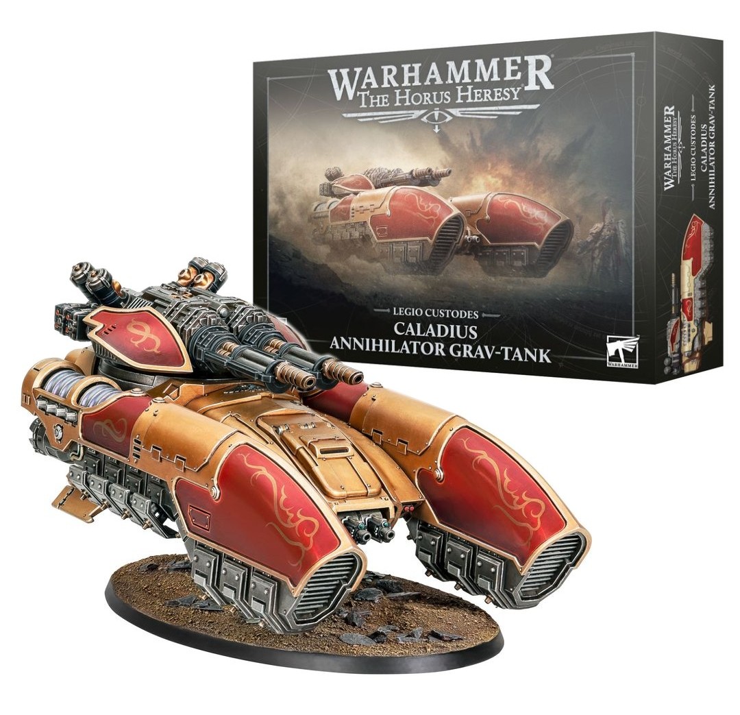 CALADIUS ANNIHALATOR GRAV-TANK – The Caladius Annihilator Grav-tank provides the Legio Custodes with a mobile, protected platform upon which to mount one of the heaviest elements of their arsenal – a twin Arachnus blaze carronade.