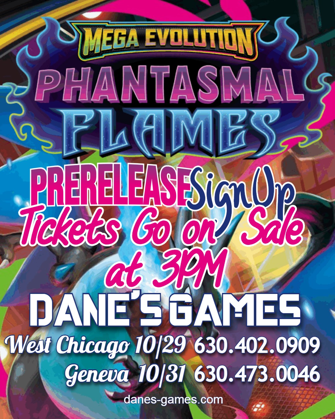 Especially scarry is the Phantasmal Flames prerelease coming up this week! The Mega Evolutions prerelease can be signed up for on our shop page. Signups begin for West Chicago on Wednesday October 29th at 3pm and for Geneva on Friday October 31st at 3pm. Sign up are online only and are $30. Spots are limited so besure to save the date. Prerelease kits are reserved for those attending the event. If you miss the event for any reason you will be refunded the full amout after the prerelease date.