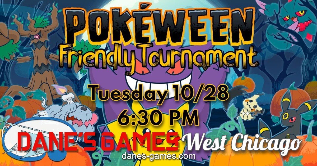 This Tuesday is Pokeween at West Chicago! We have a bunch of cool prizes and fun games! It is fun for all ages so come join us IN Costume! Beware any ghost types and Zubats when you arrive!