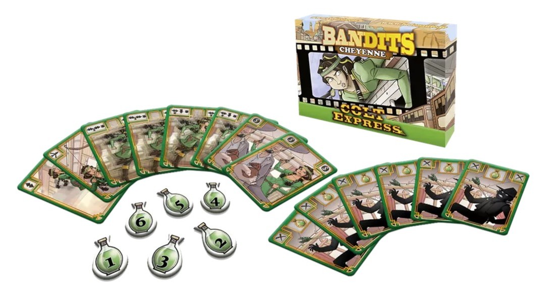COLT EXPRESS BANDITS – CHEYENNE: Cheyenne moves faster than any other bandit. When she ends movement where there are other bandits, she takes one purse from each of them. Cheyenne wins if she is the richest remaining bandit.