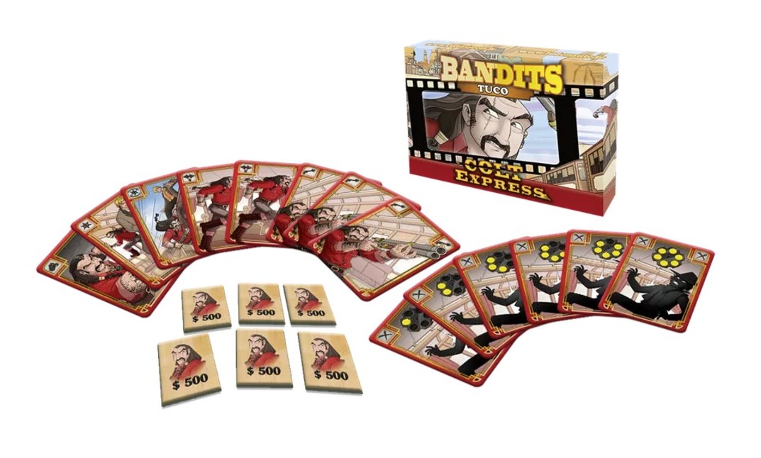 COLT EXPRESS BANDITS – TUCO: If a player plays an action that brings the Marshal to the same location as Tuco, he receives a Wanted token (worth $500).