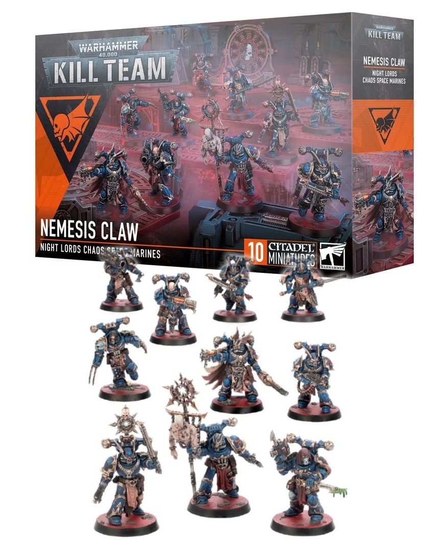 KILL TEAM: NEMESIS CLAW – NIGHT LORDS CHAOS SPACE MARINES – A Nemesis Claw is made up of the most psychotic and savage of Chaos Spaces Marines from the twisted Night Lords Legion. This multipart plastic kit allows you to build 10 Nemesis Claw Chaos Space Marines.
