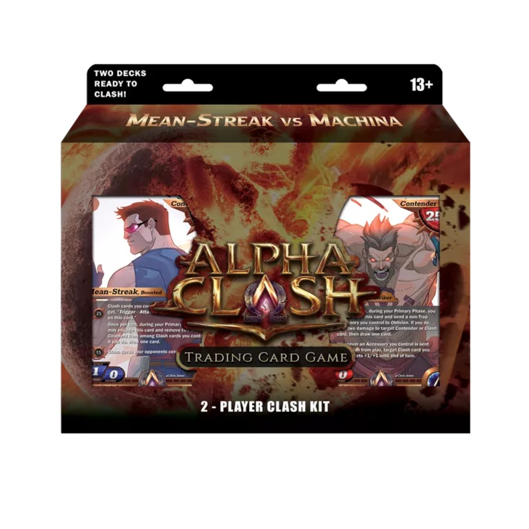ALPHA CLASH Mean Streak vs. Machine – Inside you will find two preconstructed decks with Contenders Mean-Streak (Alpha) and Machina (Alpha), as well as AxO promo card.