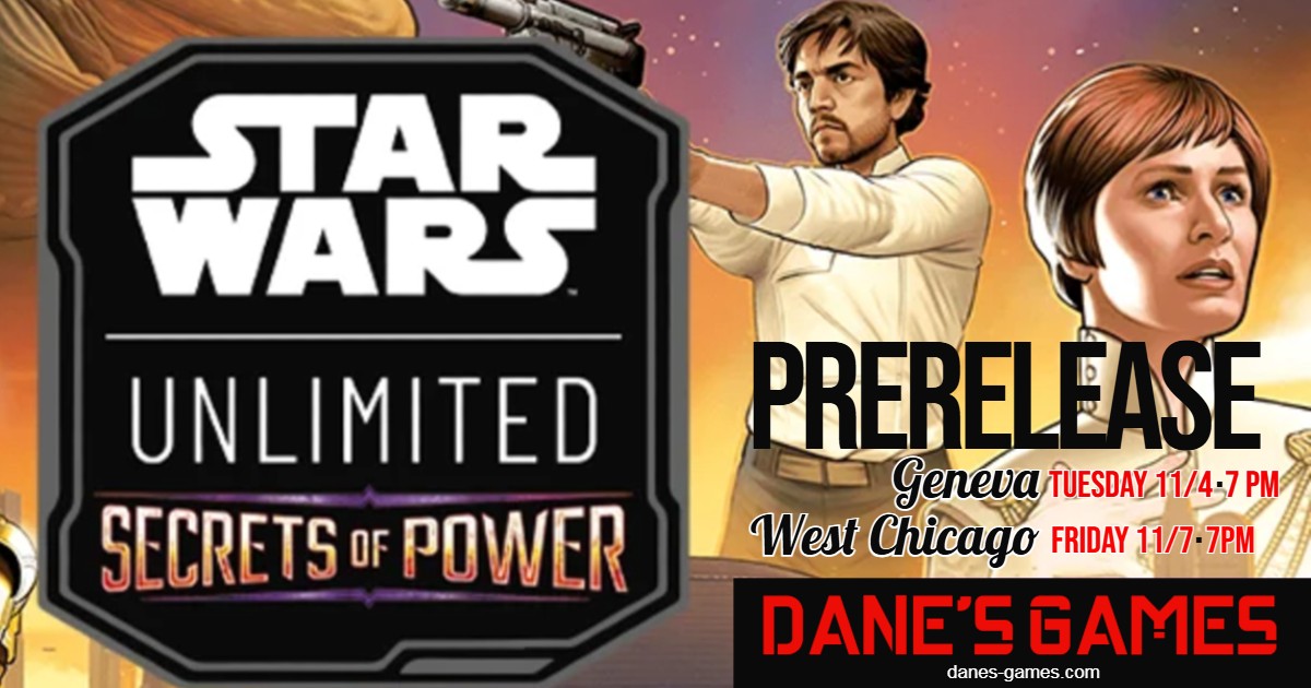 Also this week is the prerelease for Star Wars Unlimited – Secrets of Power! Come play with the brand new Star Wars Unlimited cards and fight the galactic fight! Recruit Padme or Emperor Palpatine to fight for your side. Dew it! Our prerelease is this Tuesday in Geneva at 7:00pm and this Friday at 7:00pm. The galaxy needs you!
